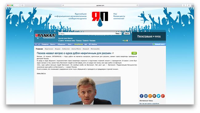 Рекламы на «Я плакалъ» тоже немного. «Не идеально реагируют на наш сайт рекламодатели, — разводит руками представитель проекта. — К сожалению, им больше нравятся социальные сайты или супербелые сайты типа Adme».