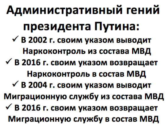 Путин снова переходит в блиц. Вот вопрос на экране про Национальную гвардию. «Зачем она подчиняется президенту? Нет доверия» Ответ: «Почему нет доверия? Просто все силовые ведомства подчиняются президенту».