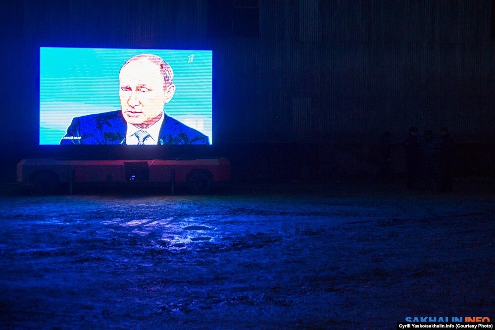 – Этот завод стоит на берегу моря. И перед его воротами, буквально перед шлагбаумом, который ограничивает территорию, была небольшая, наверное, метров 20 на 20 площадка, где обычно ставят машины те, кто приехал на завод, но не имеет пропуска на машину. Вот на этой площадке и был установлен экран. Стояли наши местные ребята телевизионщики, записывали людей. Но там было очень мало людей. Буквально человек 6-7, которых я застал, – несколько озерчан и 3 человека приехали специально на запись прямой линии из другого поселка, где они уже несколько лет ведут борьбу с местным мэром. Они надеялись, что их вопрос, может быть, увидит Путин. Но, к сожалению, он не увидел.