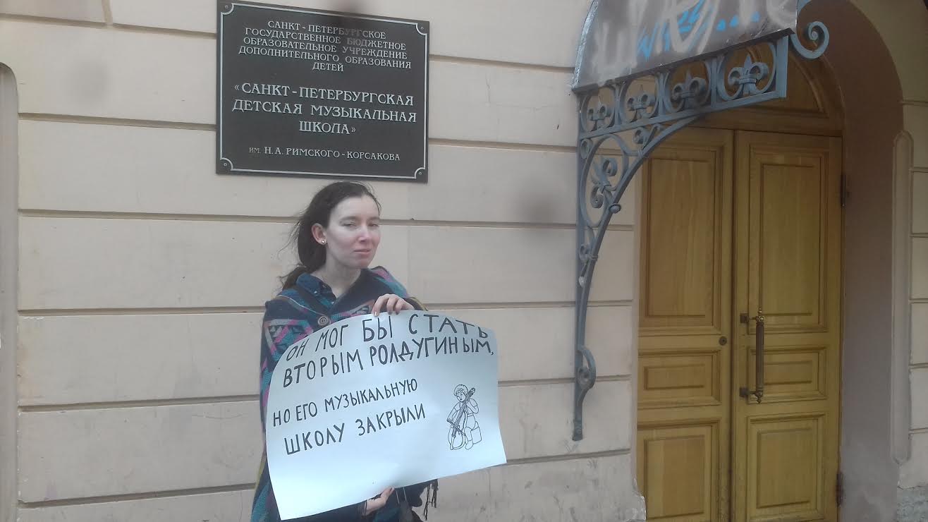 В Петербурге двое активисток движения "Весна" вышли на Думскую улицу к дому 1-3, где находится музыкальная школа имени Римского-Корсакова, единственная школа в городе, где взрослые люди могут обучаться музыке на бюджетных местах. Акция была задумана как протест против коррумпированных чиновников и как поддержка музыкальной школы, где, по сведениям активистов, число бюджетных мест собираются резко уменьшить. На плакате, который изготовили участники пикета, было написано: "Он мог бы стать Ролдугиным, но его музыкальную школу закрыли", то есть участники пикета имели в виду офшорный скандал, где фигурирует имя известного виолончелиста Сергея Ролдугина, друга Владимира Путина. Ученики школы и прохожие живо реагировали на пикет, выражая сочувствие музыкальной школе.