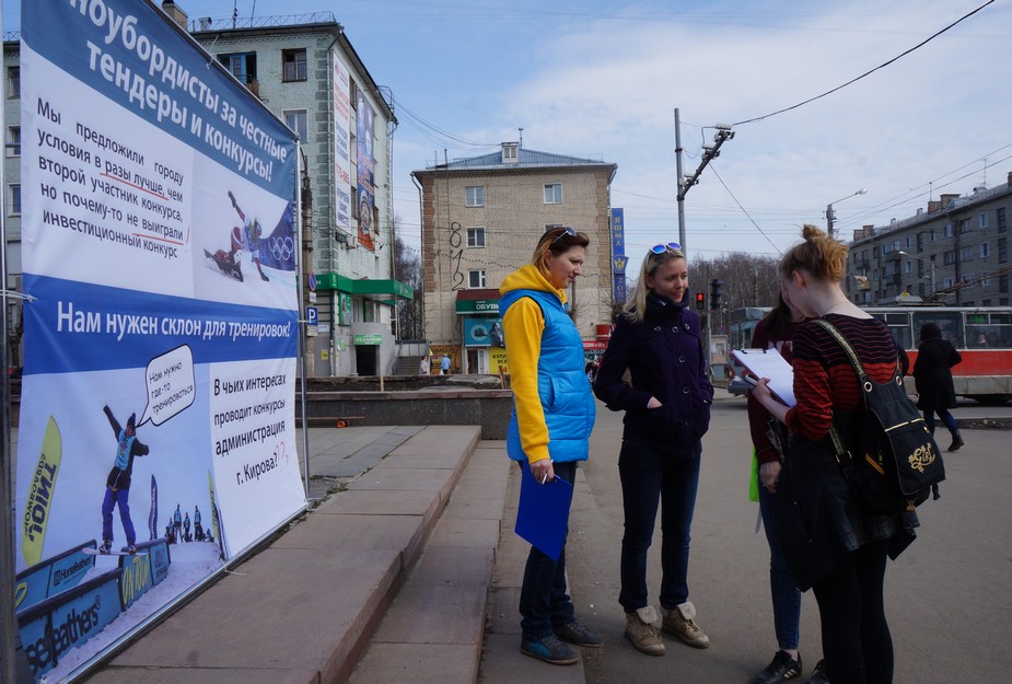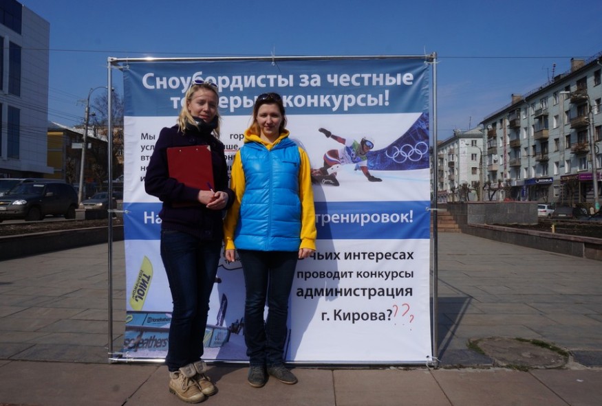 «В чьих интересах проводит конкурсы администрация Кирова?» — такой вопрос написан на информационном плакате активистов. Председатель федерации сноуборда России в Кирове, тренер детских секций Анна Червоткина считает, что добропорядочный участник закупок не может выиграть конкурс без связей или административного ресурса.