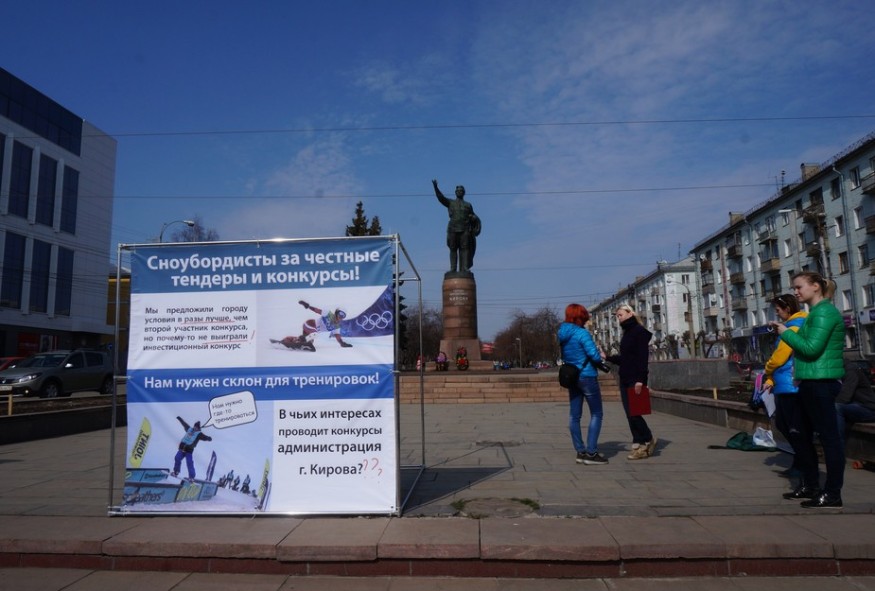 Кировские сноубордисты вышли 16 апреля на пикет к памятнику Кирову, где потребовали от городских властей открыто проводить конкурсы и тендеры по выделению земельных участков, — передает корреспондент «7x7» с места событий.