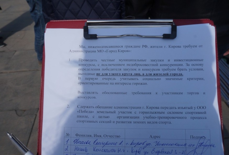 На пикете активисты собирали подписи горожан за проведение честных конкурсов. Еще они потребовали передать изъятый у ООО «Победа» земельный участок с горнолыжным склоном спортивной школе №3. Федерация сноуборда шесть лет занималась именно на горнолыжном комплексе «Победа». Но прошлой весной администрация города расторгла договор аренды с руководством комплекса, и федерация осталась без постоянного места тренировок.