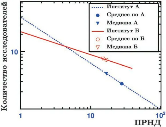 Следующий пример наглядно демонстрирует абсурдность сравнения эффективности работы научных учреждений путем сравнения средних показателей, вычисляемых для каждого института в целом. Рассмотрим характеристики двух гипотетических институтов, назовем их «институт А» и «институт Б», продуктивность сотрудников в которых характеризуется степенными зависимостями х —α с показателями α = 0,8 и 0,4 соответственно (см. рис. 2). Предположим, что в институтах А и Б работает по 300 сотрудников, а диапазоны их ПРНД (x) составляют соответственно от 1 до 100 и от 1 до 40. При указанных параметрах распределений средние значения ПРНД составят для А и Б 27,8 и 16,8 соответственно. Следуя критериям ФАНО и Минобрнауки, опирающимся на сравнение средних значений по институтам, институт А должен быть однозначно признан более результативным по сравнению с институтом Б. Однако даже с первого взгляда видно, что отмеченными на рис. 2 средними значениями ПРНД невозможно охарактеризовать научные коллективы в целом. Действительно, всего несколько сотрудников из трехсот в институтах А и Б имеют значения ПРНД близкие к средним по соответствующему научному учреждению. Более того, из рис. 2 видно, что начиная со значения ПРНД равного 4 количество сотрудников в более «слабом» (по определению ФАНО и Минобрнауки!) институте Б превышает количество сотрудников с аналогичной результативностью в институте А. Общее число сотрудников, имеющих ПРНД более 4, в институте А составляет 237, а в более «слабом» институте Б — 252! Высокая степень сотрудничества научных работников, однородность тематики и методики проводящихся исследований, единство научной школы института Б могут давать более равномерное распределение результативности с меньшим α. Тем не менее, следуя абсурдным критериям ФАНО и Минобрнауки, институт А однозначно должен быть признан лучшим по отношению к Б исключительно на основе среднего ПРНД его коллектива. Однако только при условии схожести тем и областей исследований в А и Б небольшое число сотрудников с ПРНД превышающим 40 действительно можно рассматривать как неоспоримое преимущество института А. Нельзя исключить ситуацию, когда трудоемкость и ресурсоемкость проводимых институтом Б исследований сужают диапазон ПРНД сотрудников и их формальной результативности, но это не ставит под сомнение значимость их научных результатов. Следует подчеркнуть, что сопоставление медианных значений ПРНД институтов А и Б (см. рис. 2) аналогично сопоставлению средних и ведет к тем же ошибочным выводам.