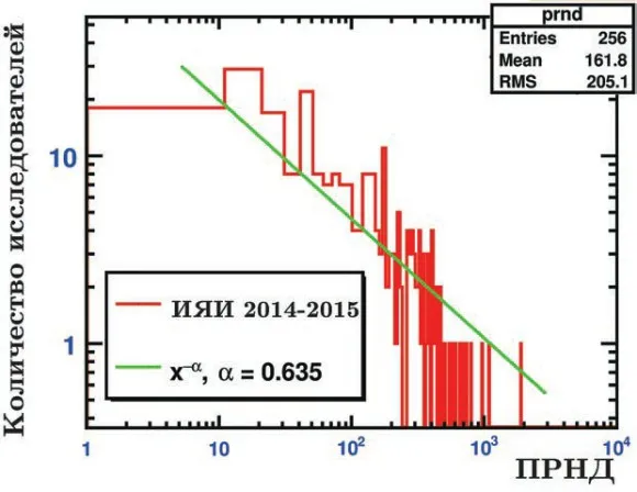 На рис. 1 представлена гистограмма частотного распределения величин ПРНД сотрудников ИЯИ РАН, построенная на основе данных за 2014–2015 годы, доступных на сайте института. Интересно, что распределение в целом можно уверенно аппроксимировать уже знакомой функцией x —α, где α = 0,635. Важно отметить, что распределение ПРНД за 2011-2012 годы также неплохо описывается х —α, но с α = 0,881, и эта разница, по-видимому, связана с некоторым изменением правил расчета ПРНД в 2016 году. Зависимость вида х —α характерна для ИЯИ РАН как многопрофильного научного центра. Широкий диапазон изменений ПРНД связан не только с различной индивидуальной результативностью сотрудников, но и в значительной степени определяется спецификой и средой их деятельности: большая международная коллаборация, настольный эксперимент, теоретические исследования, обеспечение работы научной инфраструктуры (ускорителя, нейтринных детекторов). Это наблюдение подтверждается тем, что более однородная результативность (и, соответственно, малые значения α) получается для отдельных подразделений ИЯИ РАН, поскольку заметная часть работ обычно публикуется совместно с коллегами по лаборатории по единой общелабораторной тематике.