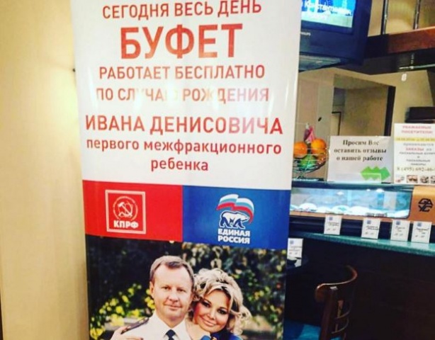 В буфете Госдумы появился баннер, предлагающий всем желающим перекусить бесплатно в честь рождения «первого межфракционного ребенка», сообщает «Российская газета».