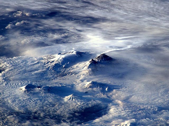 В центре фотографии, сделанной Тимом Пиком, видны три расположенных поблизости друг от друга действующих камчатских вулкана: Ключевской, Безымянный и Ушковский. Над вершиной Ключевской Сопки стелется парогазовый шлейф.