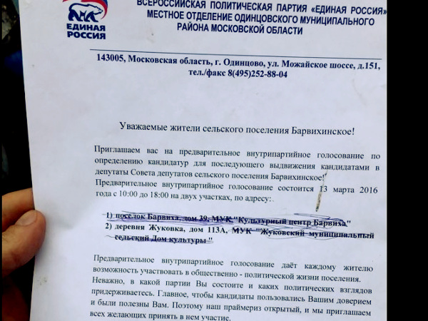 Приглашение на праймериз ЕР в Барвихе Фото: © "Рублевка 24" В это время проходила ротация членов ЦИК, Владимира Чурова не оказалось в новом составе комиссии и 28 марта ее возглавила Элла Памфилова — правозащитница с опытом политической деятельности еще в перестроечное время. Несмотря на то, что отношение к ней среди оппозиции достаточно неоднозначное, ее авторитет заставлял поверить, что ЦИК теперь не будет идти на откровенные фальсификации.