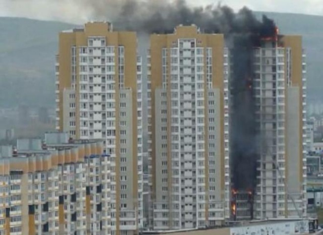 Напомним, в сентябре 2014 г. на ул. Шахтеров загорелся 25-ти этажный дом. Вспыхнул фасадный утеплитель, и за несколько минут огнем оказалось охвачено все здание.
