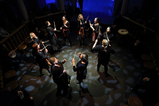 Что еще интересно — неожиданной для нас стала реакция зрителей после лабораторного показа. Некоторые из них расспрашивали, сознательно ли мы строили концерт как своего рода учебную программу. Например, показывали, как можно по-разному выстраивать звук в пространстве или строить взаимодействие тела, голоса и инструментов — скажем, звука дарбуки, дополняемого ударами по грудной клетке певцов.