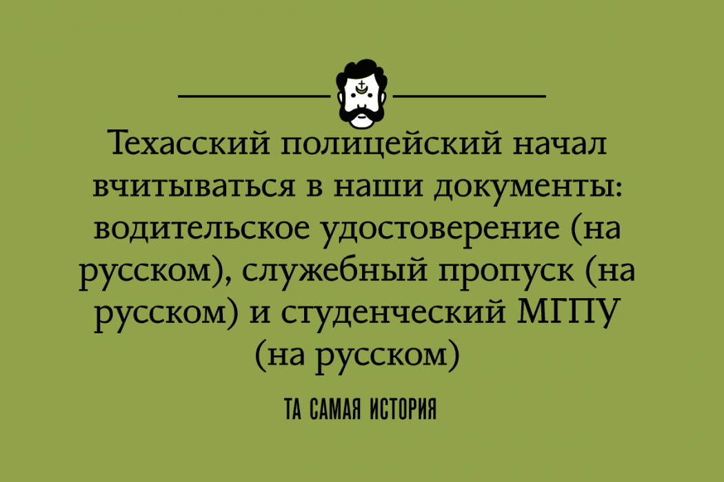 В итоге все мы лежали на тротуаре в свете автомобильных фар. Мужчина что-то быстро говорил по рации, а женщина нас обыскивала. Не найдя ничего из того, что, видимо, искали, они начали вчитываться в наши документы, а именно: в водительское удостоверение старого образца (на русском), служебный пропуск в цирк (на русском) и в студенческий МГПУ (на русском).