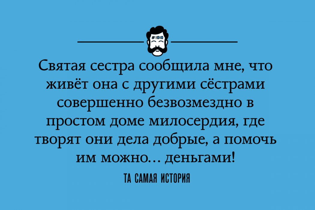 А мне на том конце и ответили, что у них там простой (простой!) дом милосердия, в котором совершенно безвозмездно живут сёстры этого самого милосердия и творят дела доброты. Мне-то лично никакого дела нет — безвозмездно или каким ещё образом живут святые сёстры в сей возрождающейся обители. Я просто спросила: «Вам конкретно помочь-то чем?». Сестра на том конце не растерялась и выпалила: «Деньгами!».