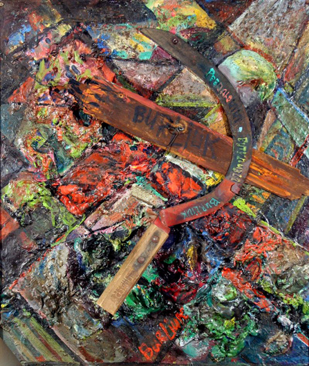 Давид Бурлюк. Ассамбляж с серпом. 1917 Однако прием копирования, выработанный Бурлюком и позволяющий переносить искусство на новую почву, когда-то сослуживший службу авангарду в России, приготовил также место для восприятия русского авангарда на Западе. Благодаря усилиям Бурлюка по воссозданию среды советского авангарда и его выступлениям за передовое русское искусство в США в амплуа его предводителя Нью-Йорк стал, наряду с Парижем, временной столицей русского авангарда после Москвы и Петербурга. Биография Бурлюка заставляет поставить под вопрос идею о якобы высшей ценности «оригинальности» и «подлинности», противопоставляемых «вторичности» и «подражательности», в модернизме. Принципиальная вторичность Бурлюка оказывается критической стратегией преодоления разрыва между разными частями мира — США, Европой и Россией — в разных геополитических обстоятельствах: как начала XX века, так и холодной войны.