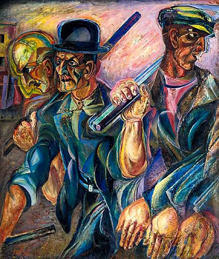 Давид Бурлюк. Американские рабочие. 1922 В своем примитивизме, с одной стороны, Бурлюк вписывается в более широкое поле «наивного» художественного письма, подобного работам «Таможенника» Руссо, с другой — в бешеную скорость перебора стилей в русской арт-среде начала XX века. Но еще до эмиграции Бурлюк упражнялся в копировании и переписывании «великих», что стало впоследствии частью его собственного футуристического метода [5].