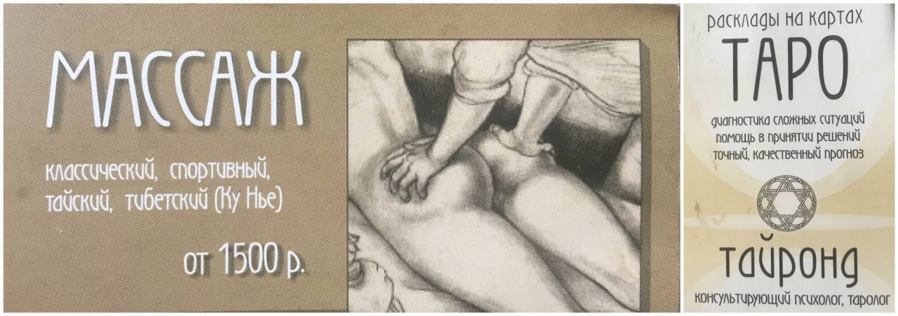 В перерыве мы пьем чай с печеньем и продолжаем знакомиться. Я получаю несколько визиток, в том числе от тароиста-массажиста Тайронда. На ней крепкая мужская рука уверенно сжимает аккуратно выведенные ягодицы подопечной.