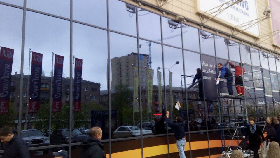 По его словам, соответствующие работы уже ведутся. В настоящий момент сняли заголовок. Никита Чеботарев заверил, что в самый короткий срок уберут всю декорацию с фасада, но затруднился сказать, как в дальнейшем украсят «лицо» торгового центра ко Дню Победы. В готовом виде оформление провисело чуть меньше суток, добавил Чеботарев.