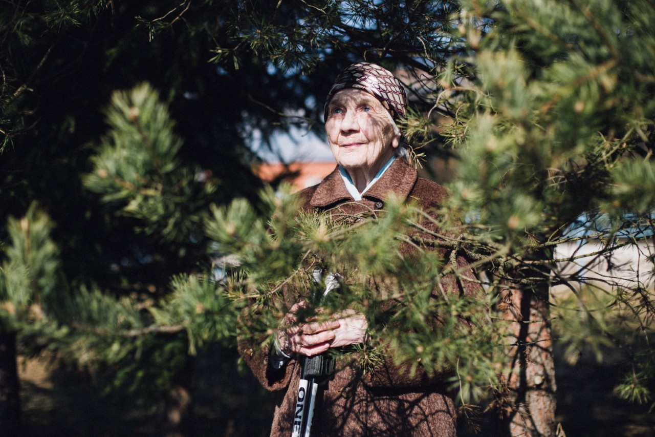 Несмотря на 86 лет, Валентина Николаевна ходит на прогулку с палочками по два часа каждый день.Фото: Ксения Иванова для ТД В части все были вооружены и стрелять умели, даже дети. Так что я стрелять умею. Из карабина, из пистолета, из калашникова. Когда я уже давно на пенсии была, то устроилась на стрельбище на Среднем проспекте — там все удивлялись, как я по мишеням попадаю.