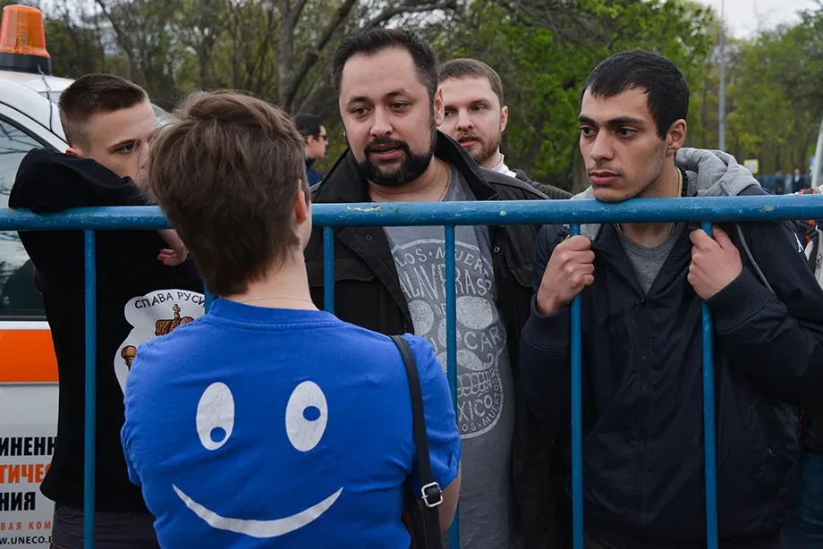 Совсем юный короткостриженый парень, на вид лет 17—18, объясняет: «Менты не против, чтобы мы тут устроили, но говорят, делайте не в сквере, а после шествия».