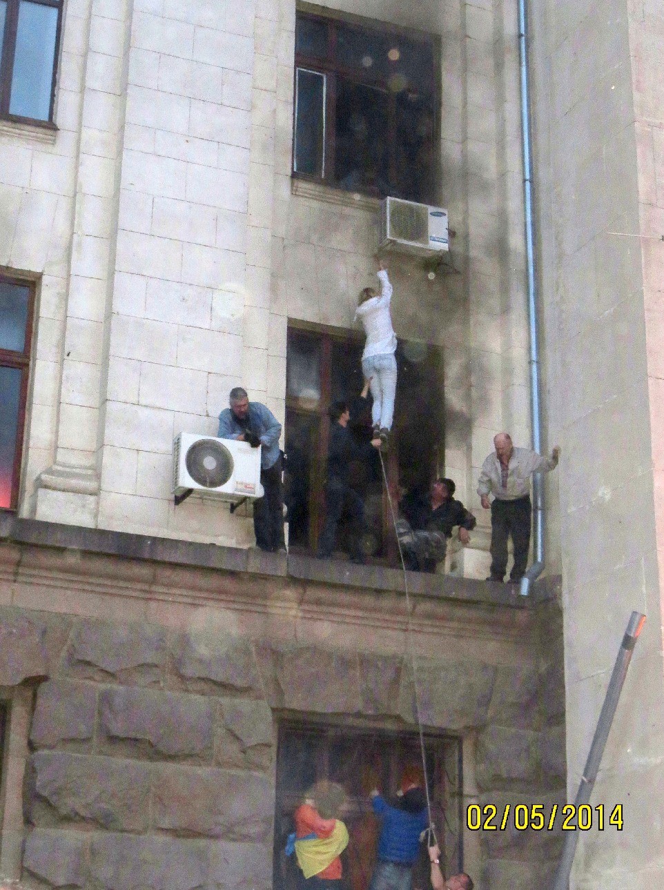 Это произошло в 19:54 и стало полной неожиданностью для всех: и тех, кто был внутри, и тех, кто стоял возле здания. На одной из видеозаписей мы увидели, что в тот момент активисты Евромайдана обсуждали ситуацию с руководителями городской милиции. "Делайте коридор, пусть выходят мирно, и их никто не тронет", – предлагал активист "Самообороны" в зеленой футболке. В какой-то момент атаман украинской казачьей организации Сергей Гуцалюк вдруг прервался на полуслове и, глядя на Дом профсоюзов, растерянно произнес: "Что он делает? Он же разобьется!"