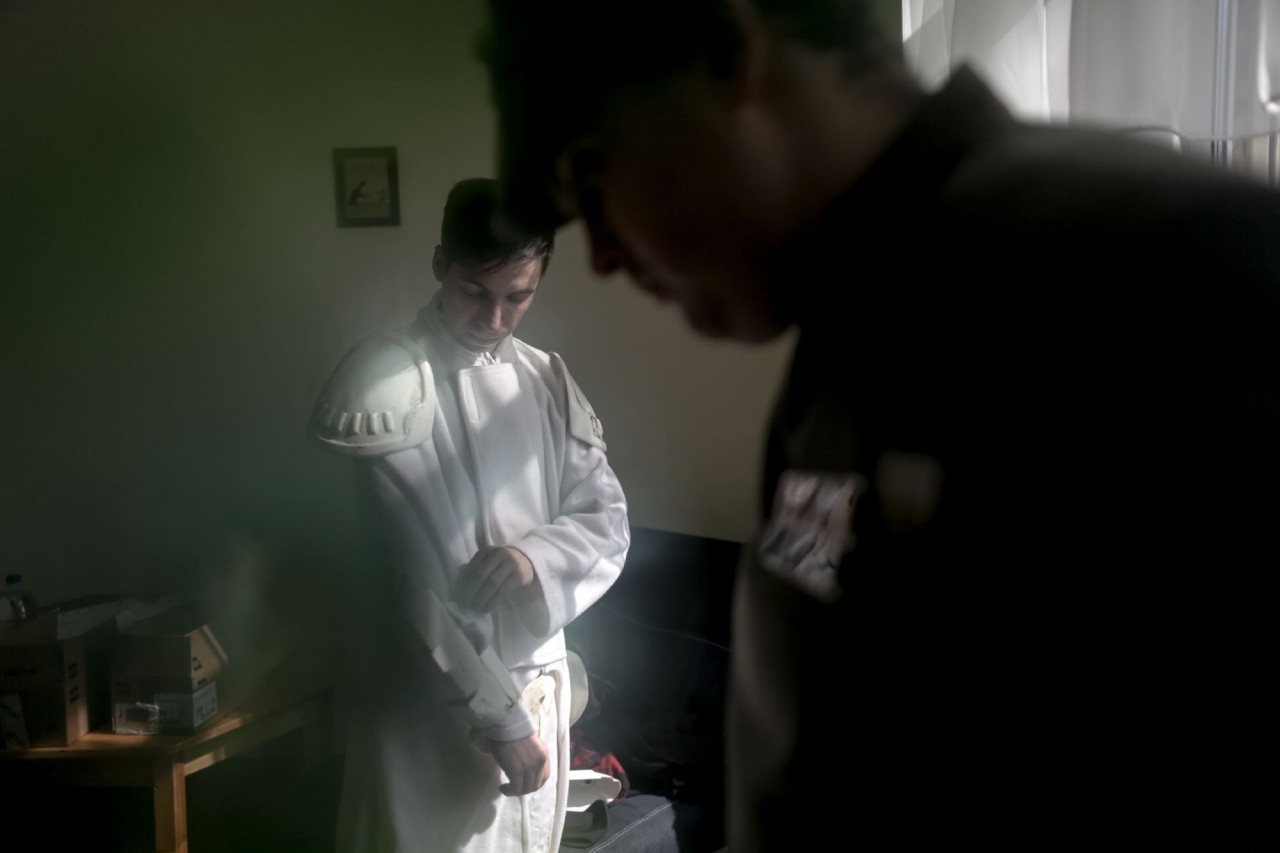 Девочкам бои не понравились — одна просто потерянно крутила меч в руках и не знала, что с ним делать, а другая отказывалась выпускать из рук игрушечного зайчика. Когда педагог все-таки заставил ее взять в руки меч, она демонстративно воткнула его в пол, развернулась и подняла обратно любимого зайца.