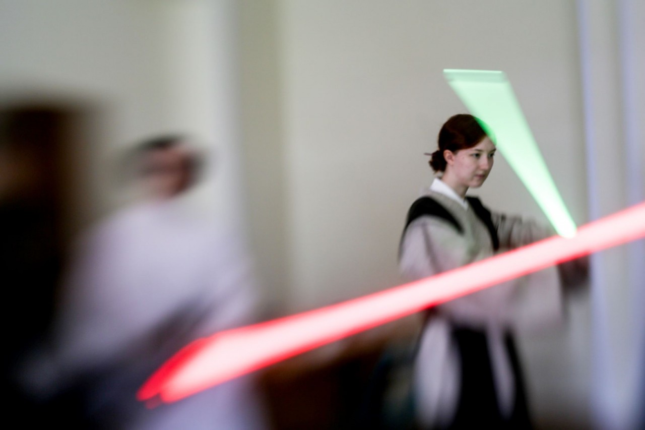 501-й Легион и Легион Повстанцев посетили центр «Пространство общения», который оказывает помощь детям и подросткам с нарушениями развитияФото: Анна Иванцова для ТД Старшие ситх и джедай провели поединок, показали стойки и блоки, объяснили, как включать и выключать мечи, и, затаив дыхание, вручили их своим падаванам. Комната мгновенно залилась каноническим шипением мечей, жужжанием их соприкосновений, восторженными криками мальчишек, кто-то на полную включил музыкальную тему боя Оби-Вана Кеноби со своим учеником-ренегатом Энакином Скайуокером, 9000000000-летний ученик ситх обрушил на Клона 119 Сережу серию жестких рубленых ударов, но тот удачно ушел в бок и сосредоточенно контратаковал. Вот-вот, казалось, из световых мечей полетят настоящие искры, и в ход пойдут уже приемы Силы: полетят стулья, столы, куски стен… Но старшие рефери, умело уловив негативную вибрацию мидихлориан, вовремя остановили поединок и приказали ученикам скрестить мечи наконечниками и поднять их ввысь в знак примирения.