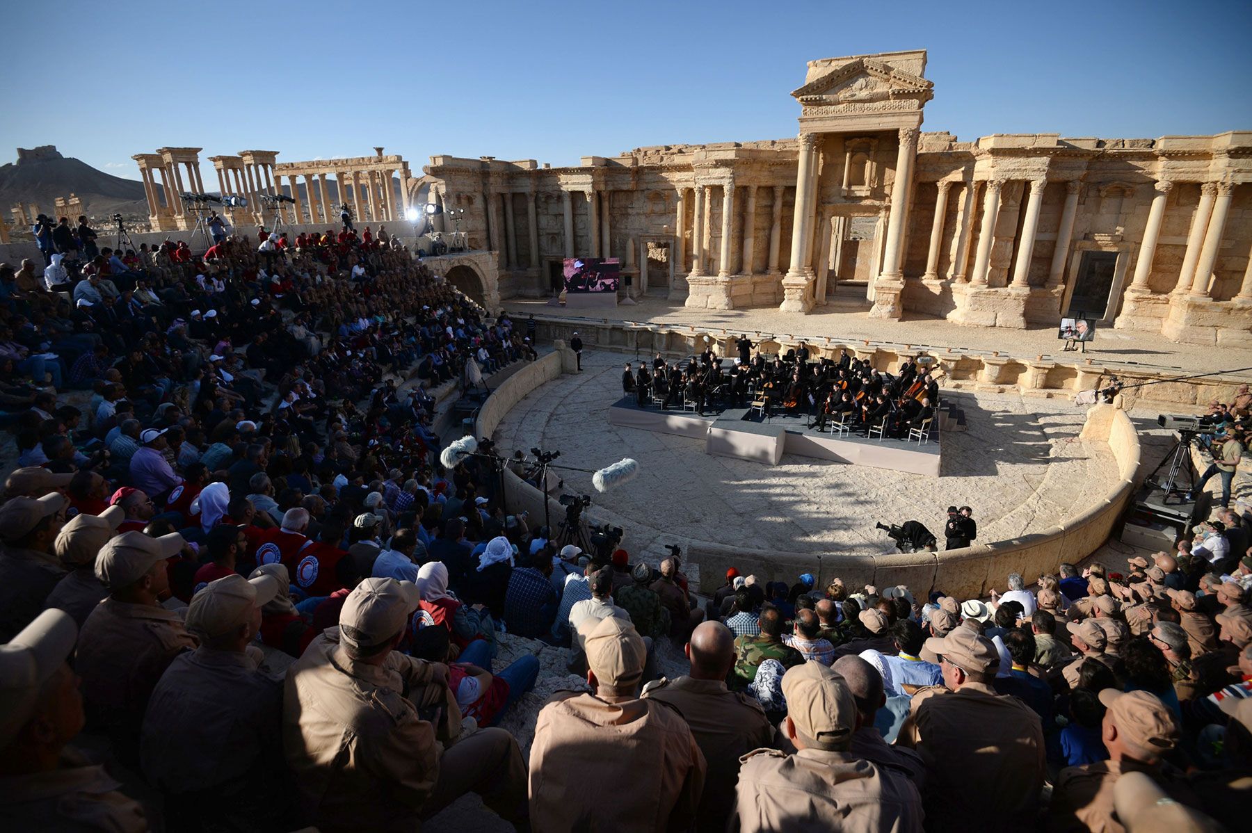 Фото: Михаил Воскресенский / Sputnik / Scanpix / LETA Концерт оркестра Мариинского театра под управлением Валерия Гергиева прошел в Пальмире 5 мая, его трансляцию вел телеканал «Россия». Концерт назывался «С молитвой о Пальмире. Музыка оживляет древние стены». В нем, в частности, принял участие виолончелист Сергей Ролдугин.
