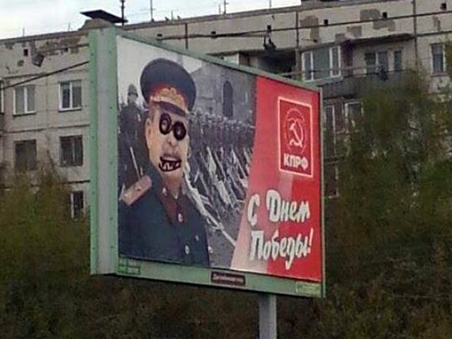 Новосибирские коммунисты решили поздравить город с Днем победы, заказав размещение 25 тематических билбордов с изображением Сталина. Разрисован был щит на Гусинобродском шоссе: вождю пририсовали очки и бородку.