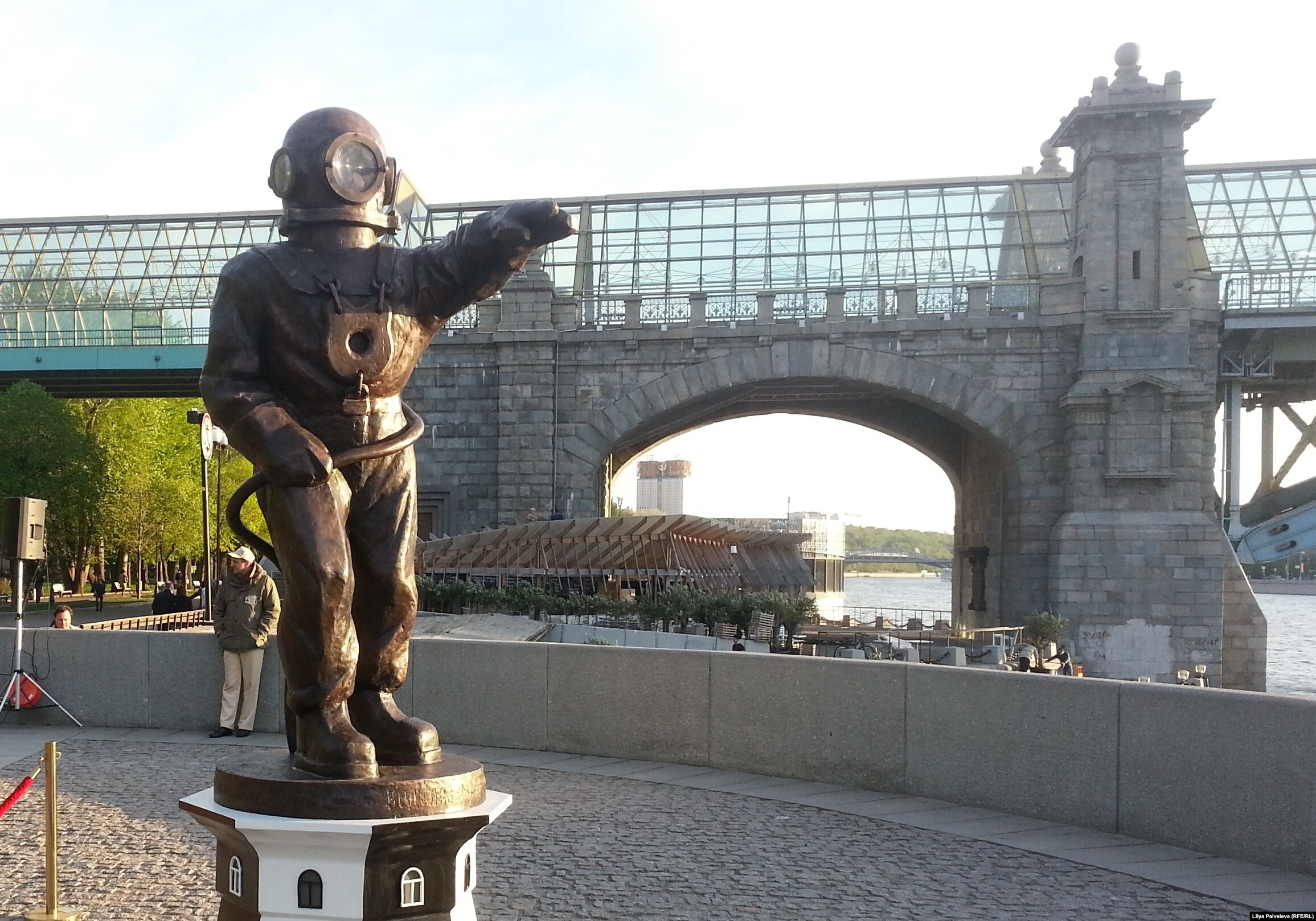 Московский скульптор Леонид Тишков сделал своего "Водолаза" трехметровым, то есть соразмерным месту и, что самое главное, человеку. В Москве стало слишком много угрюмых и пафосных скульптур. Работа Леонида Тишкова эмоционально не подавляет. Его бронзовый человек в скафандре образца 30-х годов прошлого века – уютный и веселый памятник. Хотя бы потому, что, будучи сам маяком, установлен на пьедестале в виде маяка.