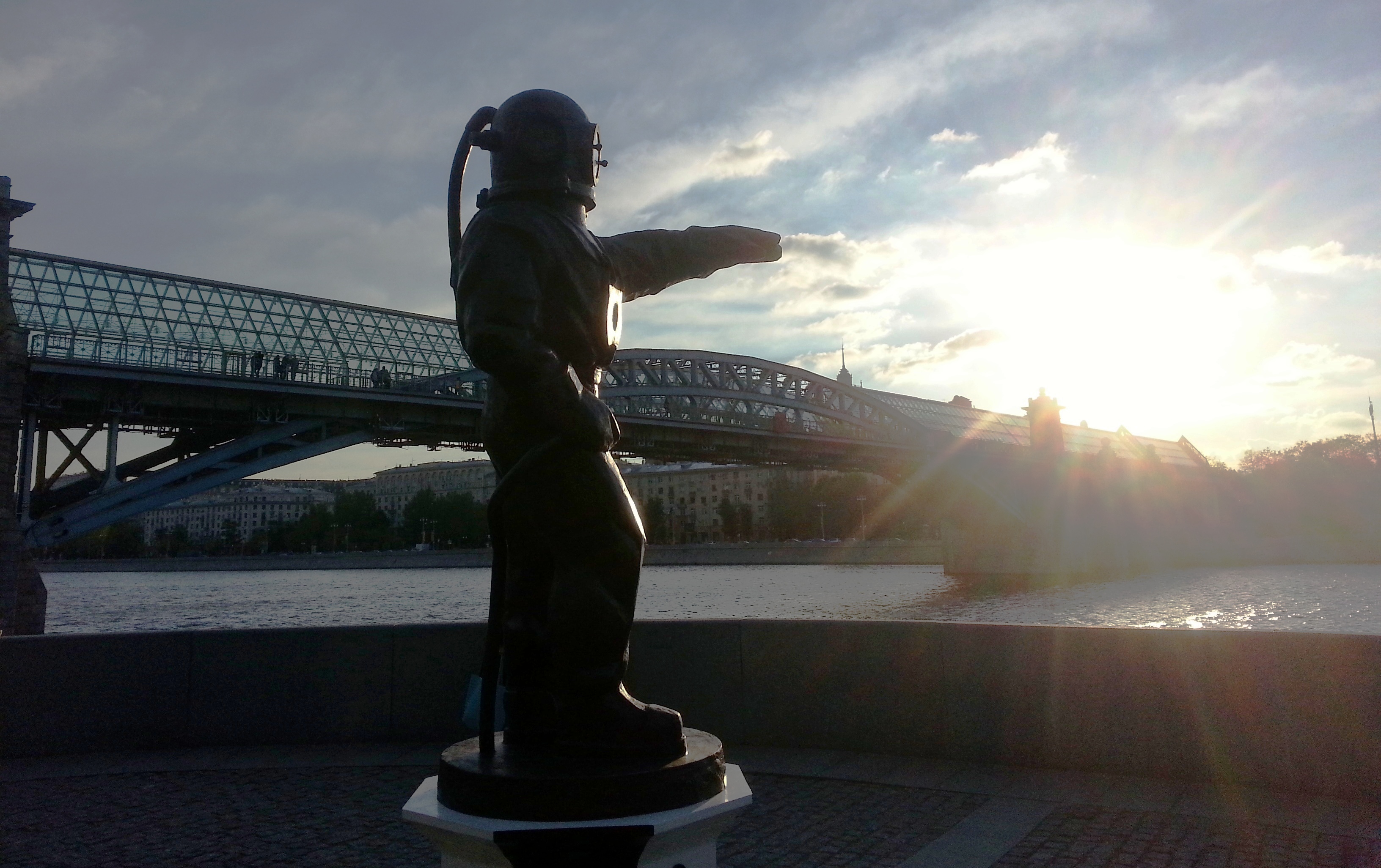 В Парке Горького, на набережной Москвы-реки появилась скульптура водолаза, которая одновременно является маяком. В темное время суток сквозь окошки шлема бронзовой фигуры подаются световые сигналы.