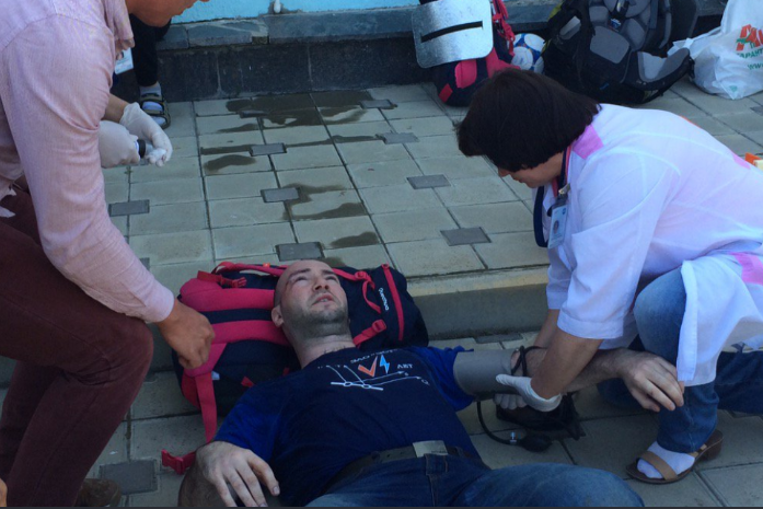 — Alexey Navalny (@navalny) Twitter По словам Навального, нападавших было примерно 30 человек. Пресс-секретарь ФБК Кира Ярмыш рассказала, что у сотрудника ФБК Артема Торчинского разбит висок, его уже госпитализировали врачи. Она также добавила, что нападавшими были казаки, некоторые из них были одеты в парадную форму.Артёма Торчинского просто били ногами пока он лежал с рюкзаком на спине. pic.twitter.com/DOyxj6U1CM
