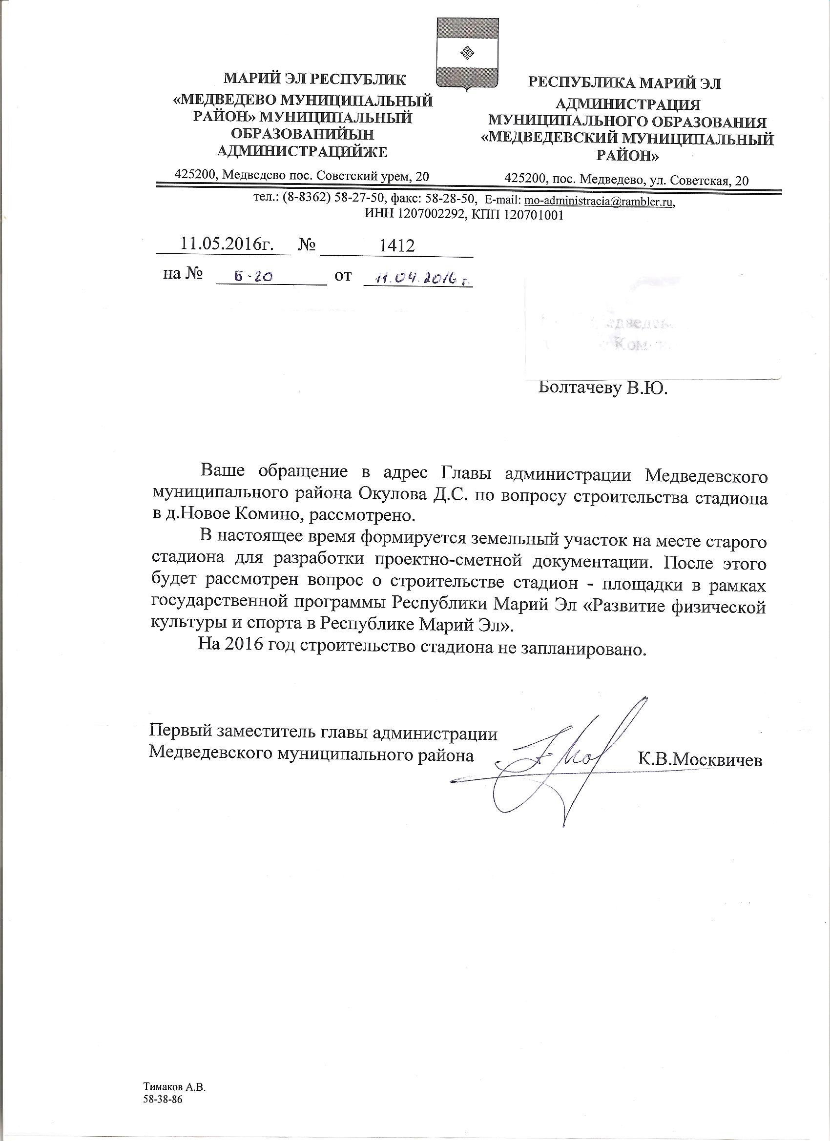 Т.к. прошёл год, а ни каких телодвижений по обустройству стадиона не было видно, мы решили узнать о судьбе будущего стадиона. Со слов первого заместителя главы администрации Медведевского района Москвичёва К.В. «земельный участок формируется», и «на 2016 год строительство стадиона не запланировано». Вот как то так, земельный участок находится в зародышевом состоянии, т.е. скорость выполнения поручений (обещаний) не известна. Осмелюсь напомнить, что «на первый день Бог создал небо, землю, тьму, воду и свет и отделил свет от тьмы; на второй день — создал твердь посреди воды, отделил воду над твердью от воды под твердью и назвал твердь небом; на третий — сушу, моря и растения, на четвёртый — светила на тверди небесной, на пятый — рыб, пресмыкающихся и птиц, наконец, на шестой — зверей земных, скот, гадов земных и человека.» https://ru.wikipedia.org/wiki/Сотворение_мира_в_Библии