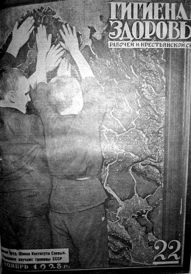 Ученики трудовой школы Института слепых изучают границы СССР. Обложка журнала «Гигиена и здоровье», 1928 г. Ирония истории в том, что национальное русское пространство впервые отчетливо выразил художник, который был не укоренен в нем и выступал по отношению к нему скитальцем, — Исаак Левитан. Будучи евреем, этот художник переводил власть черты оседлости из километров в метафизику, порождающую неопределенность, скрытую грусть и мучительное любование окраинами. Воображение у Левитана — компенсаторный способ осуществить право на пространство, доходя до экзальтированного восхищения и растворения в просторах.