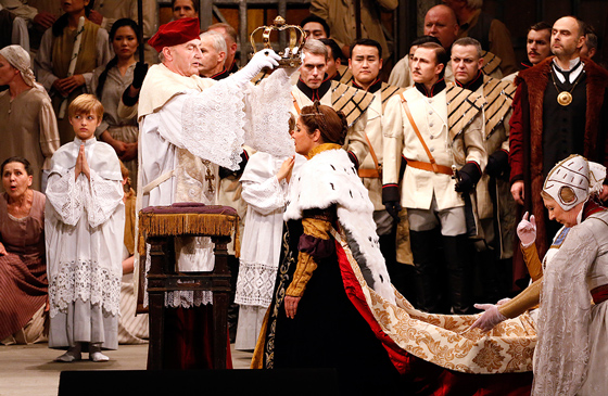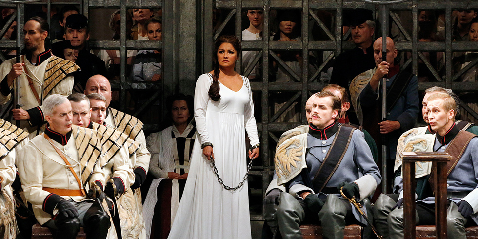 Никаких режиссерских рисков: ради Нетребко восстановили, обновив и почистив, историческую постановку 1983 года, которой Опера Земпера в свое время открывалась после восстановления. Ставила «Лоэнгрина» тогда Кристина Милиц, любимая ученица Гарри Купфера, но сегодня ее легкие диссидентские штрихи (например, формирование рыцарей и народа Брабанта в колонны, отдаленно напоминающие о Третьем рейхе) приходится рассматривать при помощи лупы. Доминируют латы и бархатные камзолы, Лоэнгрин приплывает на серебряном лебеде, а Анна-Эльза красуется то в королевской мантии, то вся в белом и регулярно падает в обморок, изящно простираясь на ковролине сцены. С непривычки смотреть тяжеловато, особенно припоминая ироничного и дерзкого «Лоэнгрина» Ханса Нойенфельса в Байройте. Но именно с этим патриархом режиссерской оперы наша дива не сошлась характерами в ноябре 2014 года, отказавшись за две недели до премьеры от партии Манон в Мюнхене.