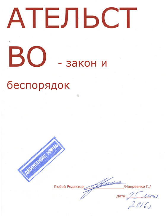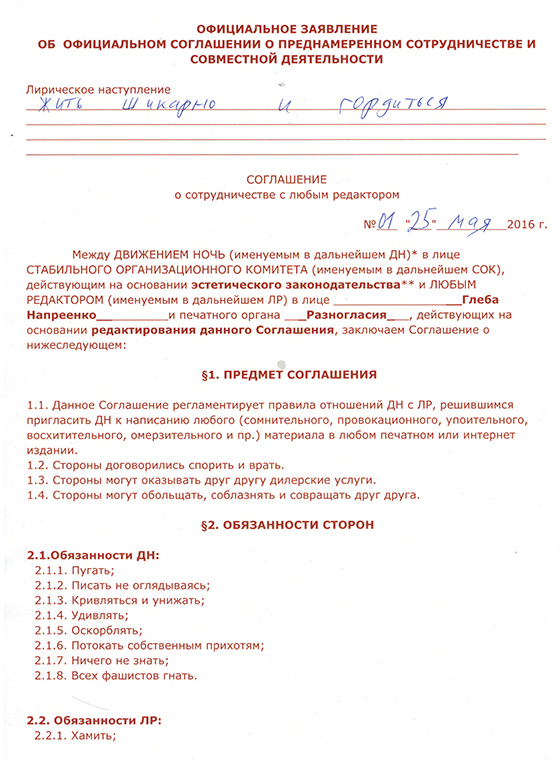 Соглашение о сотрудничестве с любым редактором, подписанное главным редактором «Разногласий» Глебом Напреенко и заверенное печатью Движения Ночь: