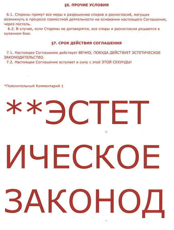 1.2. Стороны договорились никогда не договариваться, почитать ЭСТЕТИЧЕСКОЕ ЗАКОНОДАТЕЛЬСТВО [**], попирать говномораль и уважать шизоэтику.