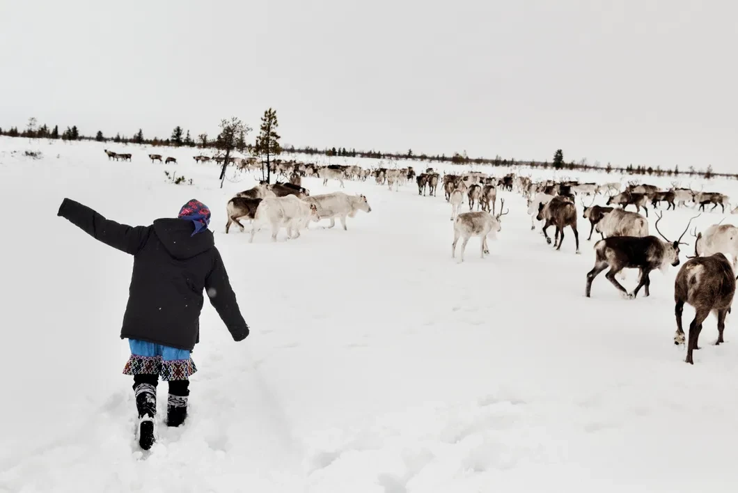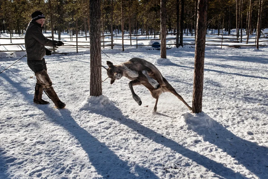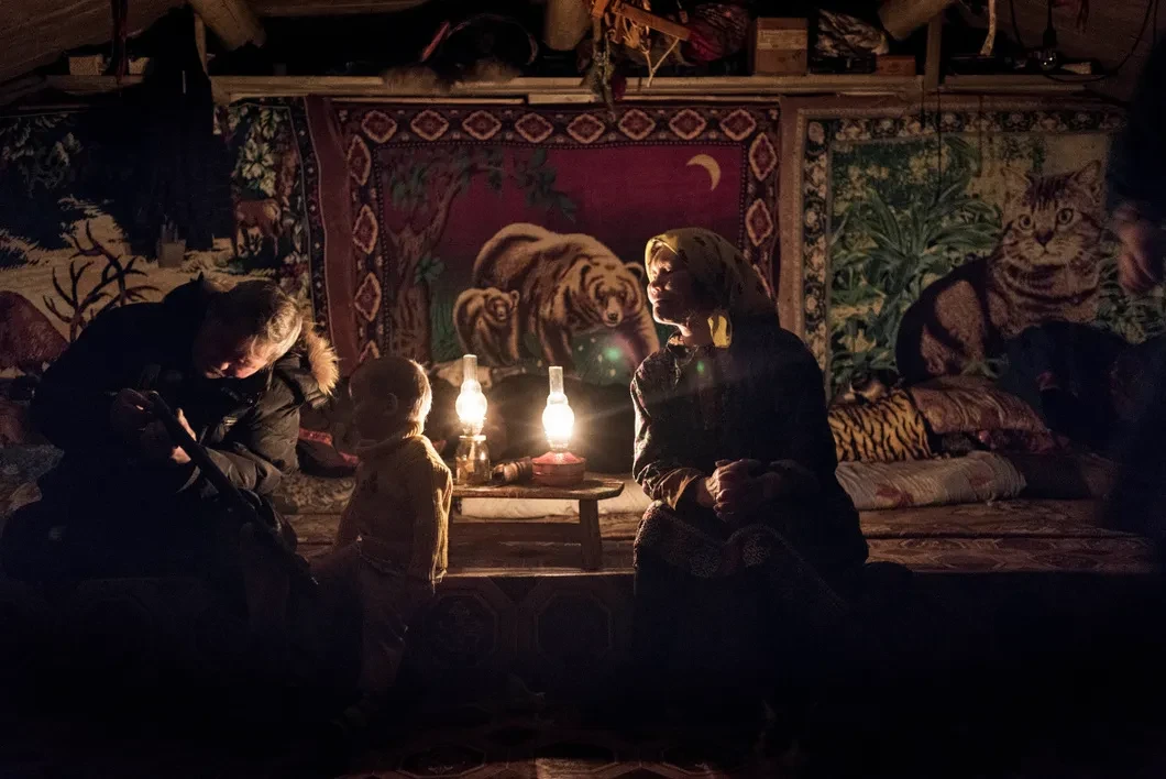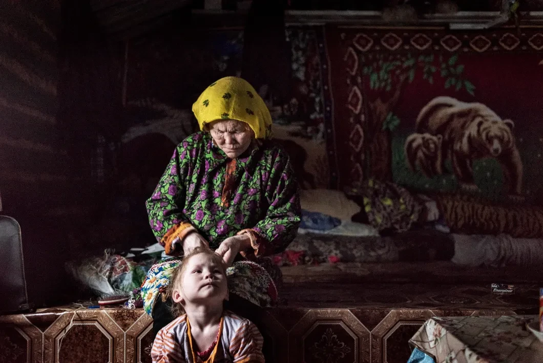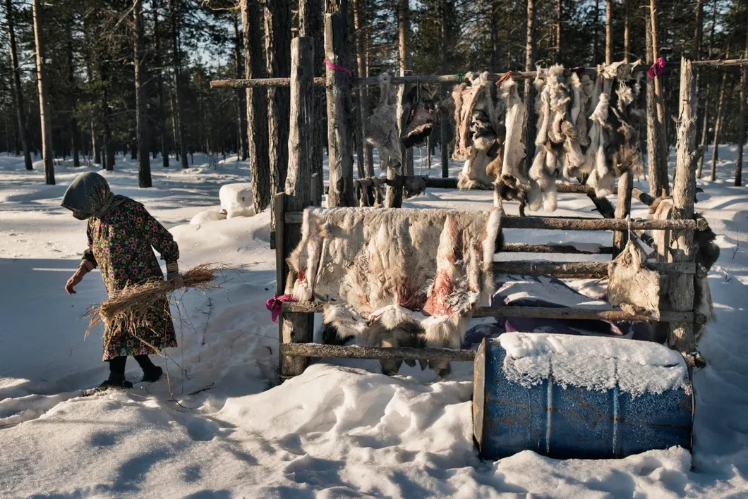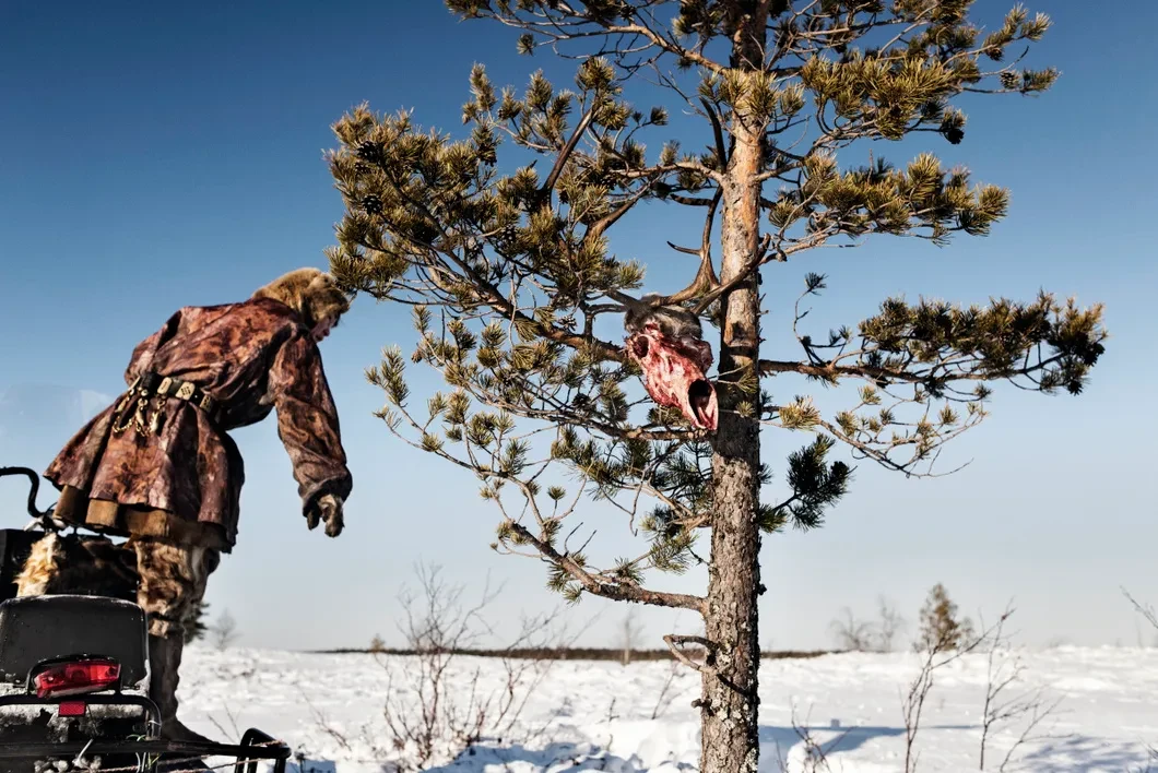 Природный парк Нумто — последнее место в ХМАО, еще не полностью занятое нефтяными разработками. Среди лесов и болот находится огромное озеро Нумто. Озеро — главная святыня для лесных ненцев и хантов, коренных жителей округа. Они считают, что это след бога на земле. Фото: Юрий Козырев / «Новая газета»Валерий Пяк — ненец, Катерина — хантыйка. Они ровесники, им по 59 лет. Женаты — 40. Валерий привез Катерину из Федоровки, за 300 километров. До свадьбы они были незнакомы. Фото: Юрий Козырев / «Новая газета»Наташа, дочка Валерия Пяка, выгоняет стадо. Фото: Юрий Козырев / «Новая газета»У Катерины и Валерия трое детей и пятеро внуков. С шести лет каждого ребенка отправляют в интернат, где он находится следующие 10 лет. Районные власти следят, чтобы дети не оставались в лесу. На фото — Катерина заплетает волосы Лиле. Фото: Юрий Козырев / «Новая газета»Жизнь в лесу предполагает ежедневный труд. Выпас оленей, заготовка рыбы, ягод, грибов и дров, выпечка хлеба. Одежду и еду лесные люди добывают себе сами, лишь раз в год выезжая в город за продуктами, тканями и топливом. На фото — Валерий Пяк забирает засоленную рыбу с осеннего стойбища. Фото: Юрий Козырев / «Новая газета»У семьи Пяк — сто сорок оленей. Свое стадо Валерий Вэкович и Катерина растили 20 лет, «из одной важенки». «Годы ушли, чтобы любоваться на них. Вся жизнь ушла». Олени — это еда, одежда, обувь, транспорт и главный смысл лесной жизни. Фото: Юрий Козырев / «Новая газета»Когда рождается ребенок, ему дарят оленя. Олени есть у каждого члена семьи. Но распоряжается ими только Валерий Вэкович. «Умру — тогда хоть что. Хоть дети их зарежут и деньги на карточку закинут — мне все равно». Фото: Юрий Козырев / «Новая газета»Олени и лесные люди существуют в симбиозе много веков. Человек заботится о них, поэтому олени приходят к дому. Олень кормит и возит, поэтому человек о нем заботится. Но они независимы и друг другу не принадлежат. От плохих хозяев олени уходятВ лесу нет ни телевизора, ни водопровода, телефон почти не ловит. Электричество дает генератор. Представление о внешнем мире формируется из фильмов «3 диска по 100 рублей», которые они покупают в торговом центре во время поездок в город. Фото: Юрий Козырев / «Новая газета»Отец Катерины был шаманом. Из-за нефтяного освоения он вынужден был покинуть Имлор — второе священное озеро хантов. Перебрался в поселок и вскоре умер. Из большой семьи Катерины почти никого не осталось в живых. Фото: Юрий Козырев / «Новая газета»Тамара (на фото) забрала свою дочь Юлю из интерната после четвертого класса. Она надеялась, что таким образом Юля останется в лесу и продолжит традиционный образ жизни. Сама Тамара не говорит по-русски. Ее лицо закрыто платком, потому что она гостит в доме зятя и нельзя, чтобы он видел ее лицо. Фото: Юрий Козырев / «Новая газета»Ханты и лесные ненцы — язычники. У них есть общие боги. Верховному богу Нуму (Торуму) жертвы оставляют на березах, темным богам — на кедрах. Важно соблюдать баланс, чтоб ни свет, ни тьма не обиделись на человека. Олени — самая желанная жертва. Фото: Юрий Козырев / «Новая газета»17. Толе, сыну Валерия Вэковича — 24 года. Он ненавидит нефтяников, «которые гадят везде», но намерен устраиваться на работу в «Сургутнефтегаз» — оператором. «Тяжело не работать, понимаешь? У меня семья немаленькая уже». Если Толя уйдет работать к нефтяникам 