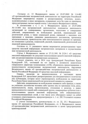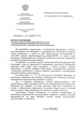 В предостережении уточняется, что в публикациях в социальной сети Facebook, а также на сайте «Центр журналистских расследований» Буджурова сообщает, что «скоро крымских татар будут отлавливать на улицах, в общественном транспорте и на рынках, обяжут носить на рукаве желтую повязку». Прокуратура отмечает, что Буджурова призывает людей к протестам. Надзорное ведомство называет указанные тексты попыткой агитации и пропаганды, направленной на возбуждение национальной или религиозной ненависти. Речь, в частности, идет о материале под названием «Теперь это наши дети», опубликованном 24 мая.