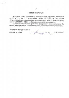 Прокуратура напоминает, что в 2014 году Буджуровой, в тот момент работающей заместителем генерального директора телекомпании «ATR», уже объявлялось аналогичное предостережение. «В случае неисполнения требований федерального законодательства Вы можете быть привлечены к ответственности в установленном законом порядке», — подытоживает в документе заместитель прокурора Симферополя советник юстиции Александр Шкитов.