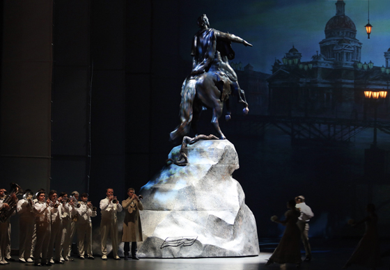 Спектакль Мариинского театра мог бы стать концентратом genius loci, способным объединить публику осознанием принадлежности к городу на Неве. У постановщиков была красивая задумка: в финале, где начатый сольной трубой «Гимн Великому городу» подхватывает весь оркестр, показать абстрактный «бал белых ночей», уже не связанный с сюжетом. Материал вообще позволял устроить сложное стереохроническое повествование — черт побери, поставить «Медного всадника» про нас, потому что мы в этом городе прямо сейчас сидим и в каждом вздохе смертный воздух пьем, да и затащить на сцену для финального соло знаменитого уличного фрика-трубача дядю Мишу, водрузив его на трансформаторную будку.