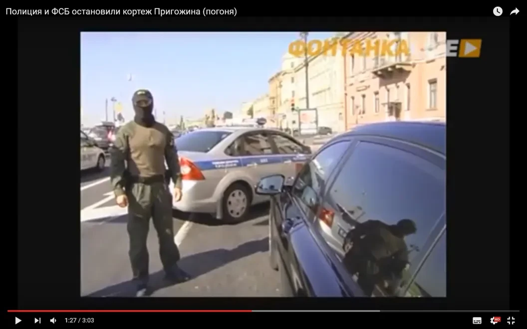 Около восьми часов утра по Английской набережной, напротив Медного всадника, промчался кортеж из автомобилей BMW 760 и Nissan Patrol. Дежурившие поблизости оперативники Службы экономической безопасности ФСБ на машинах спецбатальона ГИБДД попытались его остановить. Однако водители обеих иномарок никак не отреагировали на эти попытки. Тогда правоохранители стали преследовать эскорт и еще несколько раз по громкоговорителю просили его остановиться, но тоже безрезультатно. Гонки по центру Петербурга продолжались около получаса. BMW 760 и Nissan Patrol остановились только на Васильевском острове — у особняка на площади Трезини, где расположен офис одной из структур Евгения Пригожина. Там их и настигли наряды ГИБДД и ФСБ. По словам очевидцев, из BMW успел выйти мужчина, очень похожий на «кремлевского повара». Он быстро скрылся в особняке. А инспекторы и сотрудники спецслужб остались разбираться с непокорными водителями. Чтобы просто заставить их выйти из авто, пришлось вызывать спецназ ФСБ — «Град». Угрозы и вооружение бойцов «Града» подействовали, но разговор все равно не клеился.