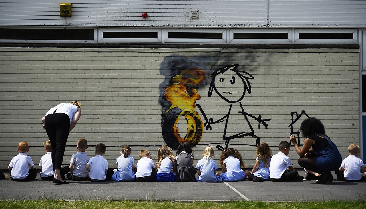 Уличный художник Бэнкси нарисовал новое граффити на стене начальной школы в Бристоле, своем родном городе. Бэнкси изобразил девочку, которая катит горящую автомобильную шину. Школьники увидели новую работу художника утром понедельника, 6 июня, когда вернулись с каникул.