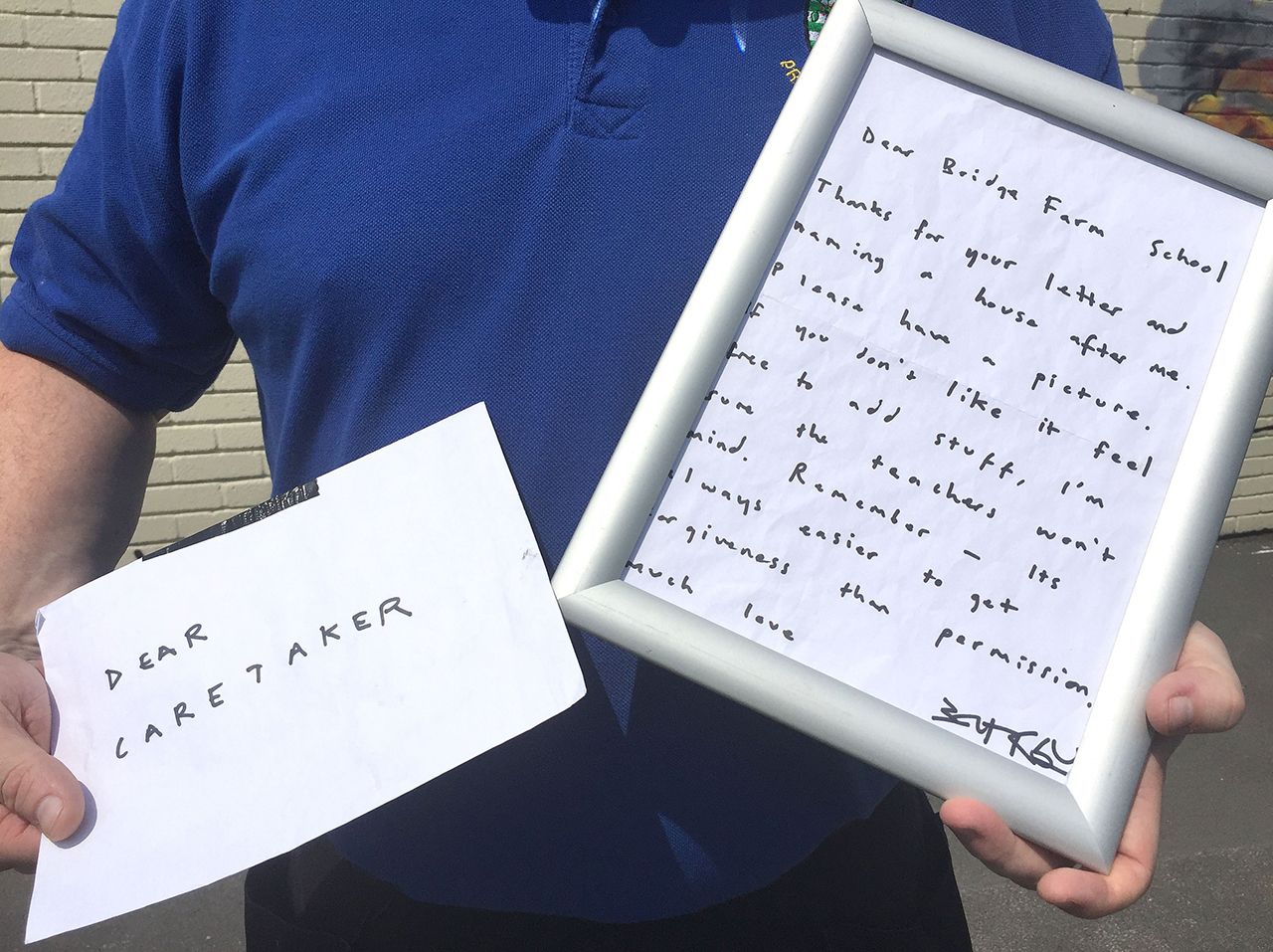 Перед каникулами школьники сообщили Бэнкси, что назвали в его честь один из своих классов. Граффити с девочкой стало ответом художника. Он также оставил письмо ученикам: