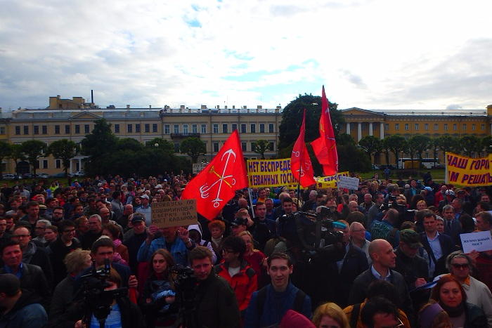 Вечером 6 июня всё было иначе. За 40 минут до начала митинга на Марсовом поле было пусто и казалось, что акция соберет не больше 200 человек. Опытные оппозиционерки грелись у «Вечного огня», вспоминали массовые протесты в 90-х и сетовали, что сейчас всё не так. «Если сейчас не выйдут, то всё», — делилась одна из активисток, работающая трамвайным кондуктором. Правда, тут же добавила, что революция в России всё равно произойдет, но позже, когда Владимира Путина переизберут на четвертый президентский срок и власти поднимут пенсионный возраст. «Да, недолго осталось», — соглашалась с ней блондинка под пятьдесят. Поговорив о глобальном, оппозиционерки вспомнили о «мосте Кадырова». «Слышала, Кадыров сказал, что мост чеченцы охранять будут?», — спрашивала одна. «Нет, но даже если будут, то люди всё равно туда гадить будут ходить. Да и я, когда проходить буду, плюну», — отвечала другая. За пять минут до митинга люди начали приходить на Марсово поле массово: хипстеры, пенсионеры, люди с флагами, иконами и панамами с надписью «Не признаю Путина президентом», сторонники свободной Ингрии и даже два статных петербуржца в костюмах древних русичей. Приходили люди и после начала митинга — в целом, по оценкам организаторов, на митинг собралось около тысячи человек.