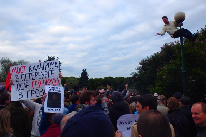 Собравшиеся до начала митинга Против «моста Кадырова» в Петербурге начали протестовать сразу же после того, как топонимическая комиссия рекомендовала губернатору Георгию Полтавченко назвать мост через Дудергофский канал в честь первого президента Чечни. Горожане читали на фоне моста стихи и призывали назвать его Ахматовским, собирали подписи под петициями, а первый народный сход тихо прошел в Красносельском районе еще 1 июня. Массовую акцию в центре города предполагалось провести 3 июня. Кадыров и «гееборец»