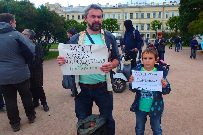 Плакаты митингующих В толпе перебрасывались фамилиями тех, в честь кого можно назвать мост, спорили о Чечне, держали плакаты вроде «Мост Кадырова в Петербурге после гей-парада в Грозном» и «Мост Дарта Вейдера» и слушали выступающих. Со сцены одни петербуржцы уверяли других, что «это наш город» и решать судьбу моста должны только горожане. Решение топонимической комиссии выступающие называли «политическим заказом», позором и проверкой для жителей.