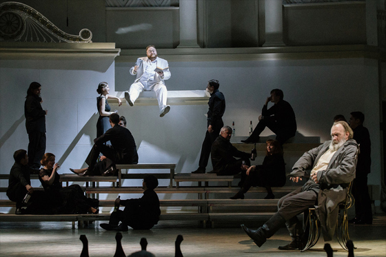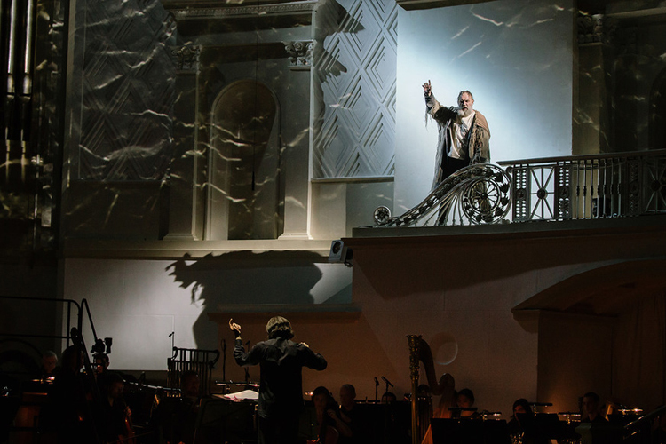 Сцену зала Чайковского, окружающие ее портики, одну из боковых лож, проходы в партере и даже пространство, где обычно стоит органная кафедра, корректно и изобретательно заполнил действием режиссер театра Покровского Михаил Кисляров вместе с видеохудожницей Асей Мухиной и художником по свету Геннадием Алексеевым. Избранный состав музыкантов возглавляемого Юровским ГАСО занял правую часть сцены, исполнив не только инструментальные партии, но и вписанные композитором в шекспировский текст реплики простодушных современных зрителей условного театра «Глобус», комментирующих происходящее. Все остальное пространство досталось большой команде чуть подзвученных солистов с выразительными тремя сестрами Корделией (Любовь Петрова), Гонерильей (Ксения Вязникова), Реганой (Надежда Гулицкая) и еще более выразительными королем Лиром (который в исполнении Максима Михайлова получился Борисом Годуновым вперемешку с Юродивым) и Шутом (Максим Пастер — Юродивый вперемешку с Риголетто). Дополнительный приятный и ни к чему не обязывающий аромат внесла стройная аккордеонистка с французской челкой, разгуливающая во время исполнения своих прямых обязанностей среди персонажей и вступающая с ними в разнообразные отношения.