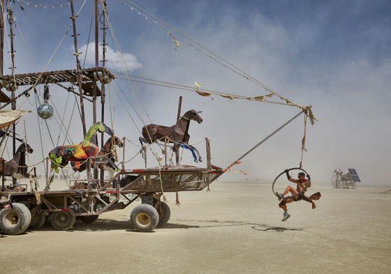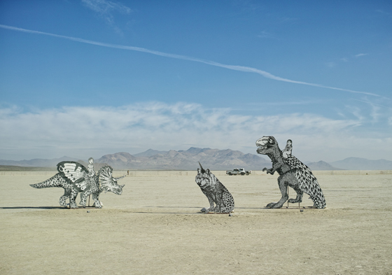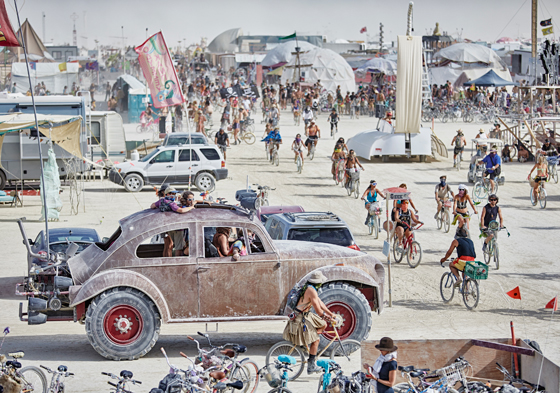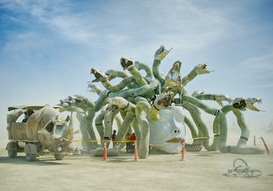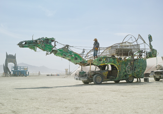 Крутых объектов — по-настоящему крутых — на Burning Man немного. Я видел штук пять. Остальные попсовые — такое впечатление, что ты попал в сувенирную лавку, а все сувениры там увеличены. Но потом меня попросили отдельно поснимать транспортные средства, потому что там многие приезжают на очень прикольных конструкциях — в виде носорога, например. Кто-то приезжает уже на готовом мобиле, а кто-то прибывает дня за два и собирает все на месте. А был такой транспорт, про который я так и не понял, как это вообще можно было выстроить. Я хочу сказать, что люди запариваются по-серьезному и готовятся к фестивалю, наверное, за год. Думаю, что единственный русский художник, который имел бы там безумный успех, — это Андрей Бартенев. Если он сделает что-то здоровенное — или даже просто будет кататься на велосипеде в своих костюмах по пустыне. Точно, ему обязательно нужно туда ехать.