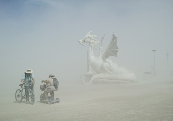 В Блэк-Рок постоянно пыльные бури, постоянно стоит пыльный туман. Все ходят в масках и очках — многие в респираторах, потому что трудно дышать. Из-за того что у всех замотаны лица, все в пыли, никого не узнаешь. Непонятно даже, мужчина перед тобой или женщина. А вообще это реально очень красиво, когда ты впервые приезжаешь в это пространство, в город, который состоит из машин, и в этот момент налетает пыльная буря. Прямо такое кино.