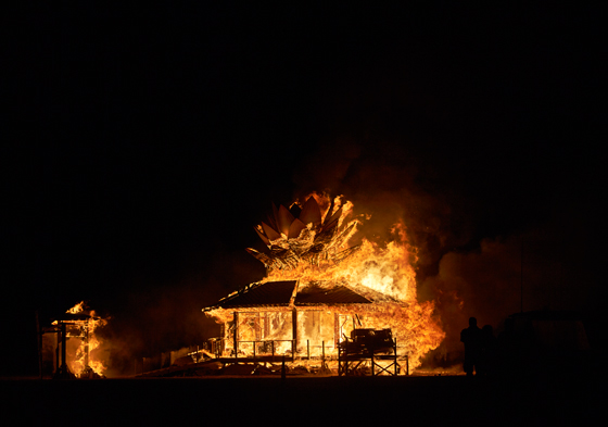 Вот так заканчивается Burning Man. Всё сжигают — Храм Лотоса, Храм умерших, самого Burning Man. Очень, конечно, красиво и страшно, но надо признать, что с безопасностью все очень классно организовано. Зрители сидят на определенном расстоянии, вокруг и пожарные, и «Скорая помощь», и какие-то охранники. Все организовано очень круто.