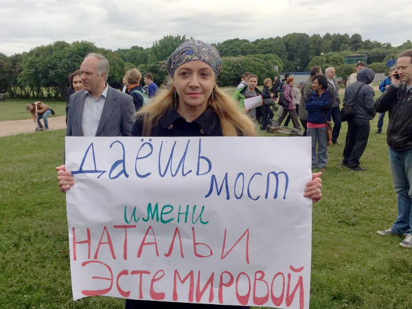 Один из плакатов митинга против переименования моста в Петербурге. Фото: Егор Максимов/@egor_mq Единственным заметным происшествием на митинге стал жест молодого человека, который забрался на фонарный столб и кричал оттуда «Кадыров — герой России». Спустя некоторое время он спустился и его задержала полиция.